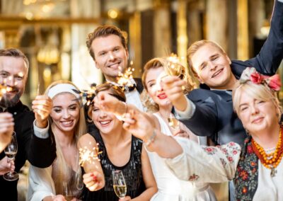 W pakiecie zapewniamy kompleksową obsługę – od wizji lokalnych i degustacji po opiekę stylistów, makijażystek i fryzjerów. Organizujemy sesje zdjęciowe, projektujemy i drukujemy zaproszenia, rezerwujemy noclegi i transport dla gości. Zadbamy o muzykę, oświetlenie, dekoracje oraz wszystkie wybrane atrakcje – DJ-a, zespół coverowy, pokaz fajerwerków czy taniec w chmurach.